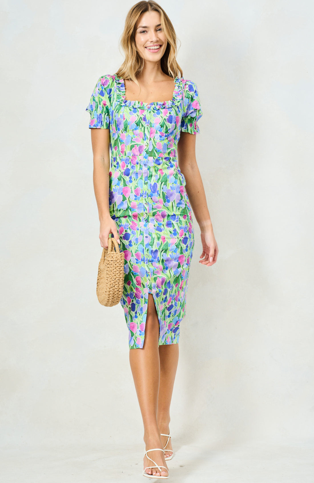 Chic, confident and flattering, The Remi blends soft spring femininity with a modern edge. The square neckline and puff sleeves frame the shoulders beautifully, while the midi pencil silhouette offers a sleek finish. In a green, blue and pink palette, it's a standout choice for desk to dinner plans as spring begins.