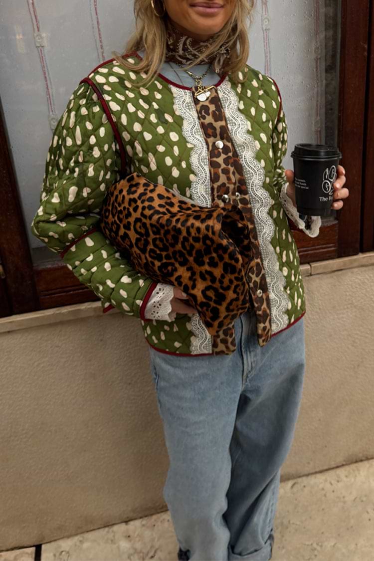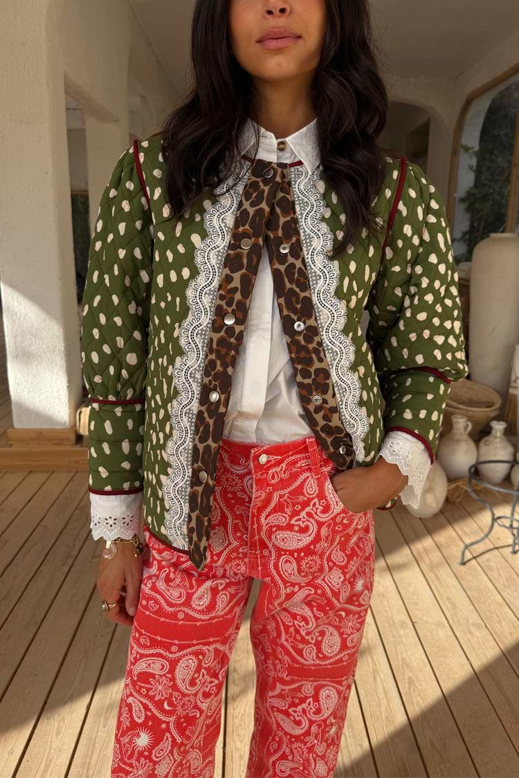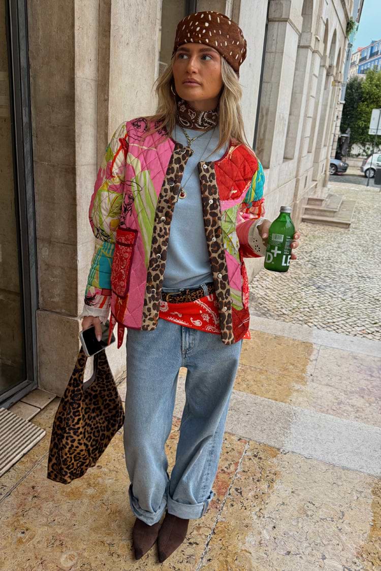 Elevate your 2026 wardrobe with this stunning reversible jacket, an NFD office essential. Featuring two exclusive in-house designs, the vibrant Pink Dallas print showcases abstract cowboy and cowgirl motifs on a bright base, reversing to reveal an elegant deer print with burgundy trim. Crafted in quilted fabric with iconic leopard print accents and delicate lace detailing at the cuffs, this padded jacket balances femininity with structure. Practical front pockets and popper fastening complete this versatile piece that transitions effortlessly from office to weekend wear.