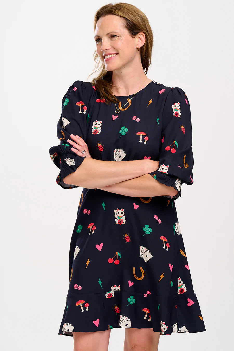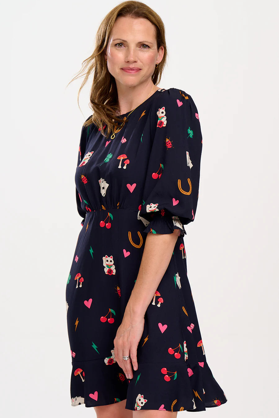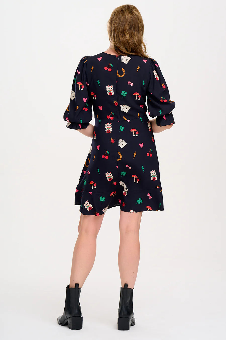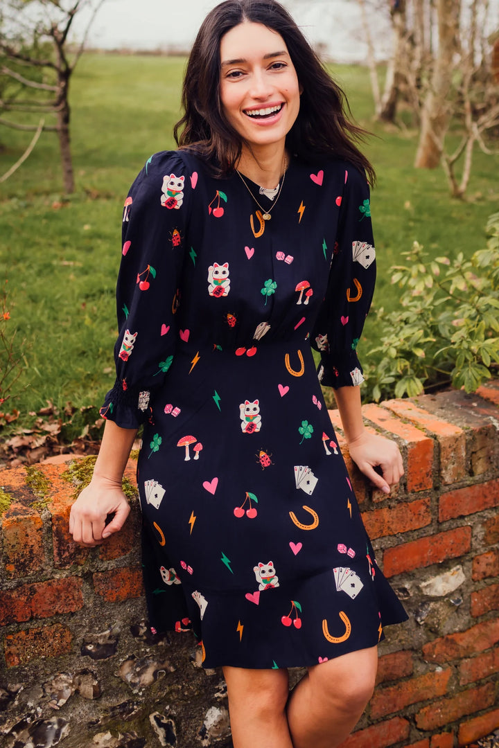 Smart yet playful, the Lorelei Fit Flare Dress shape features gathers at the shoulders, with half length blouson sleeves, a fitted waist and a frill hem skirt. Featuring our new playful Lucky Charms print of cherries, beckoning cats, four leafed clovers, hearts, lightning bolts and playing cards on black base.