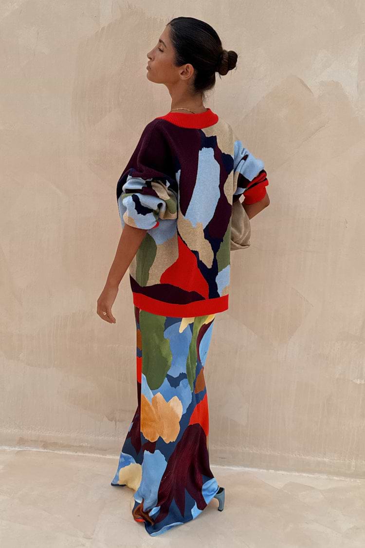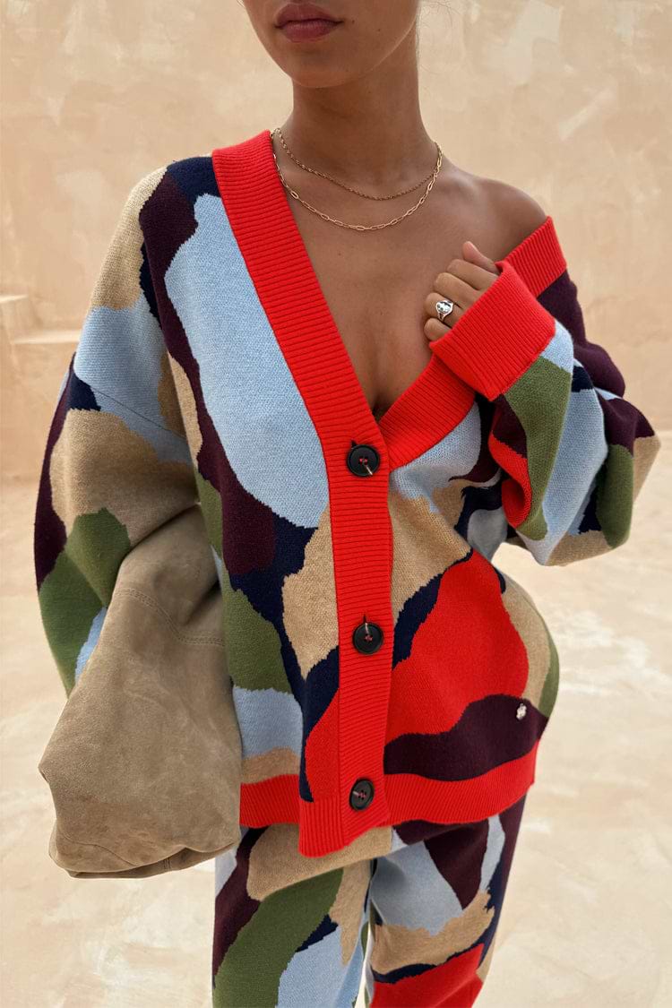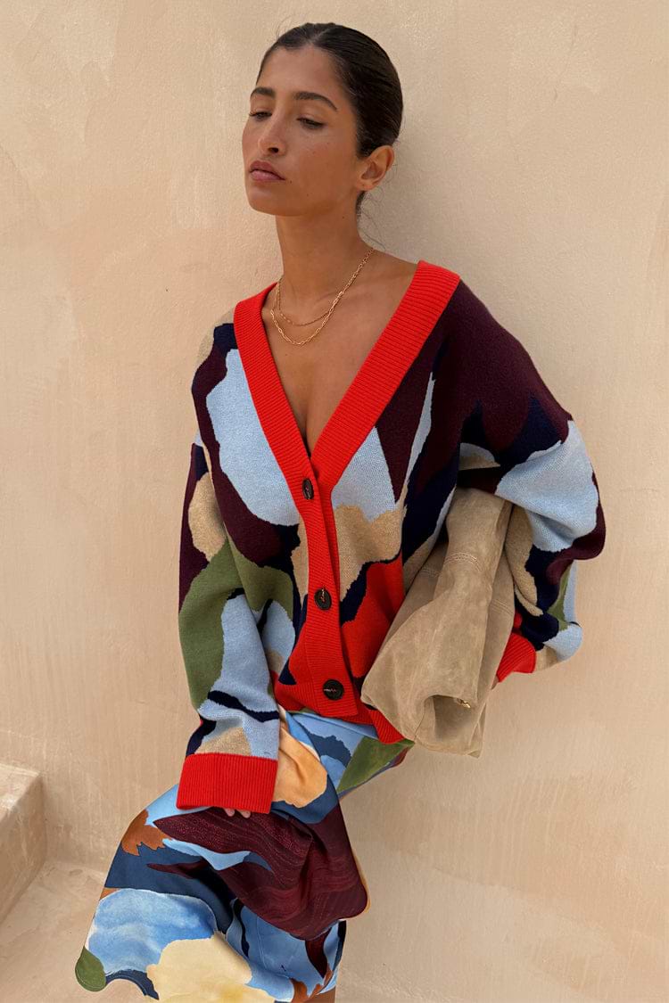 A bright and bold recoloured version of our iconic artist print, this soft touch cardigan is the perfect pop of colour to add to any outfit! With red trim detailing along the neckline, cuffs and pockets adding an extra element of texture to the simple silhouette. Wear with the matching dorris skirt for an effortless co-ord or over a tank and jeans.