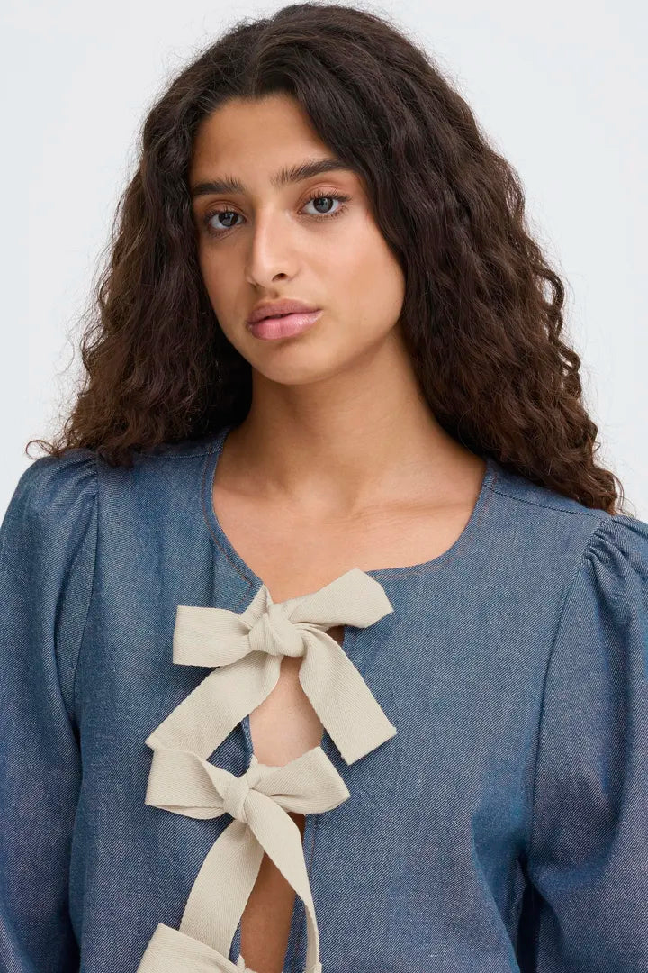 The Osana Blouse is a refined long-sleeve denim top featuring elegant bow ties at the front, combining classic denim durability with a sophisticated feminine touch. Its tailored fit and detailed design make it a versatile piece, offering comfort without compromising style. Crafted to elevate your wardrobe, this blouse balances timeless fabric with contemporary accents for a polished, expert look.