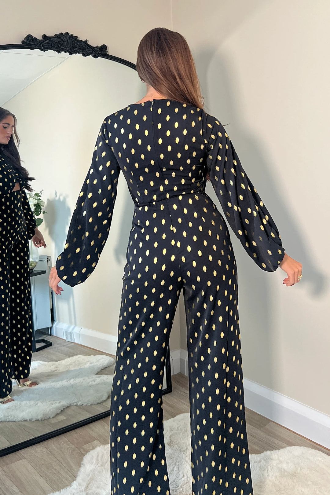 Introducing our Black Gold Foil Spot Cut Out Jumpsuit, a statement piece that exudes sophistication and luxury. The intricate black and gold foil detailing adds a touch of elegance, while the cut out design adds an edgy and fashionable touch. Elevate your style with this exclusive jumpsuit.