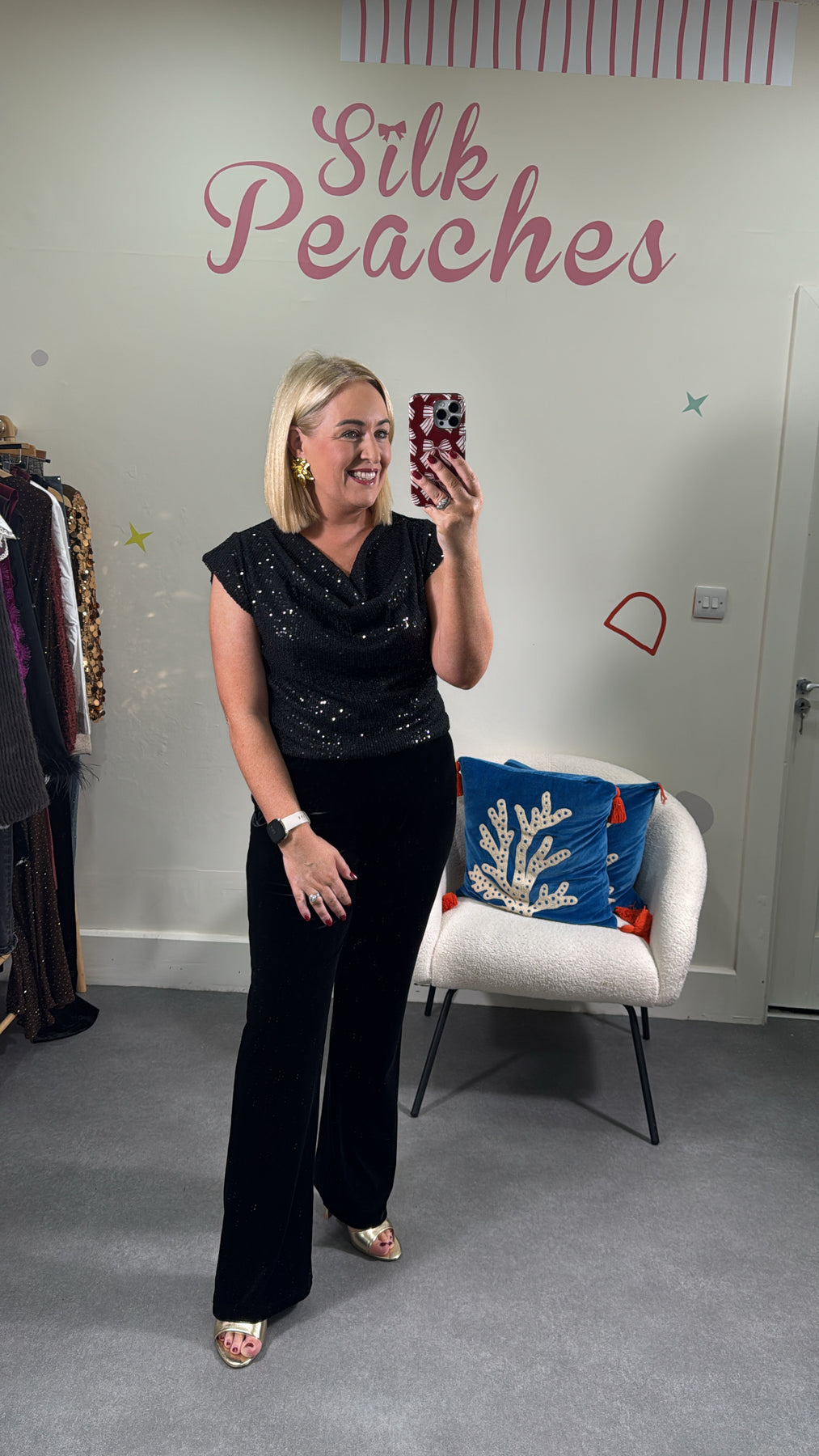 This black sequins cowl neck top is a stylish and elegant addition to your wardrobe. The shimmering sequins add a touch of glamour, while the cowl neck design adds a feminine touch. Made from high-quality materials, this top is perfect for any occasion, making you stand out in style.