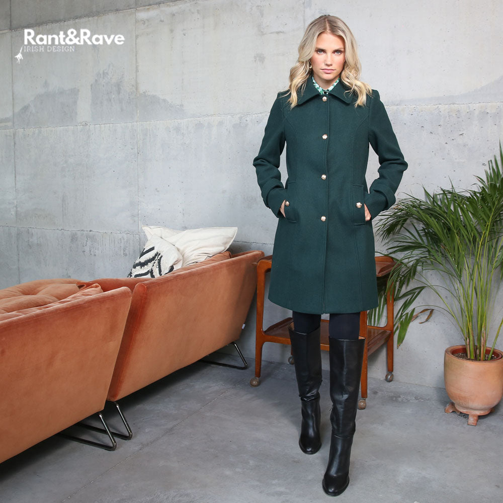 Bring a touch of timeless elegance to your outerwear collection with the Rant and Rave Kyrie Coat in Green. Expertly tailored from a luxurious wool-blend fabric, this coat offers both warmth and sophistication for the cooler months. The deep green hue is a versatile alternative to classic neutrals, adding a refined pop of colour that works beautifully with jeans, dresses, and winter knits alike. Gold-tone button fastenings lend a polished finish, while the fitted silhouette and classic collar create a flattering, feminine shape. Complete with functional side pockets for practicality, this Irish-designed coat is a stylish investment you’ll love for years to come.