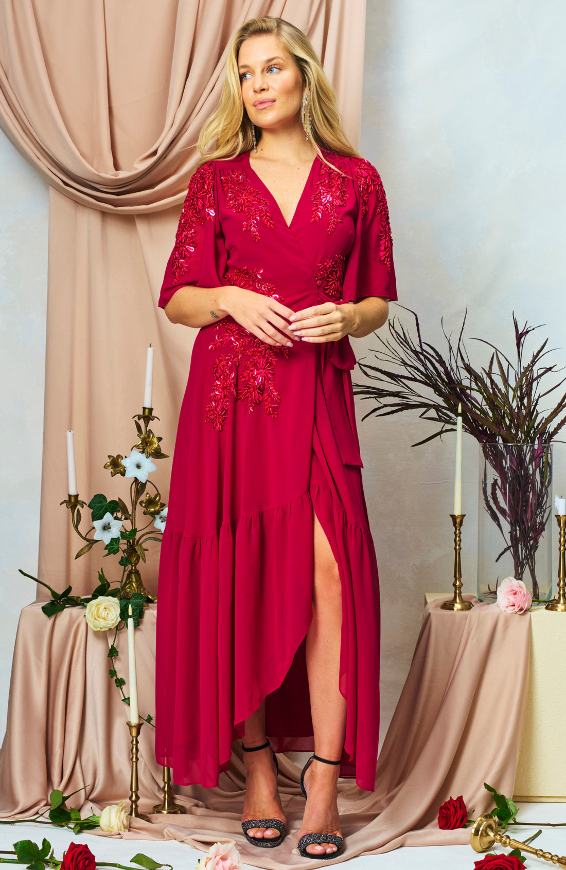 The Petal Embellished Flutter Sleeve Maxi Wrap Dress with Tie Waist