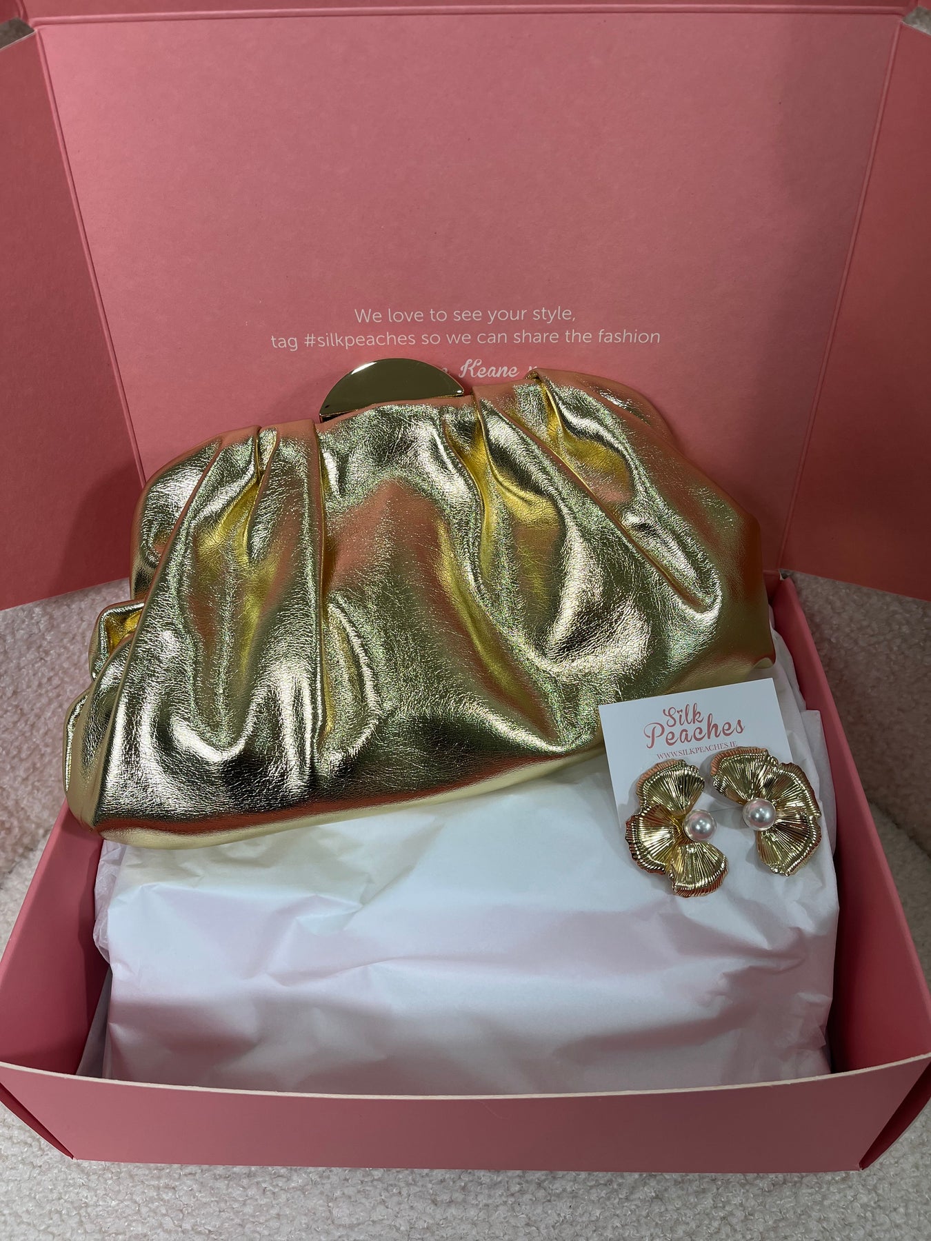 Tinsle Gift Set combines timeless elegance with festive appeal. This curated collection features a striking gold clutch paired with sophisticated gold earrings—the perfect pairing for special occasions. The clutch's sleek finish and compact design make it ideal for evening events, while the complementary earrings add a touch of refined glamour. Beautifully presented, this set makes an exceptional Christmas gift for someone who appreciates classic style and versatile accessories.